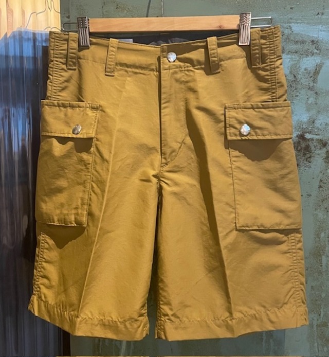 まずは、<その①=ARAN CAMP SHORTS(FIELD SHORTS)>です! 今日の様な日でも、最高に快適なんで、どうしても手が伸びてしまい、ついつい登場回数が増えちゃいますね! 当店の別注として、誕生してから、今シーズンで<13年目>位、経ちますが、残念ながら...、とうとう当店が持つ在庫で、展開終了!、となってしまいます。 初めてのお披露目となったシーズンから<数年間>は、シーズン毎に、”素材”を変えながら、この『形』により”しっくりくる”ポイント、”着地点”を求め、試行錯誤していましたが、<2017年>に、その求めていたちょうど良い”着地点”が見つかり、それ以降は変えずに、この『形』の”完成形”として、展開させて頂きました! この『CAMP SHORTS(FIELD SHORTS)』は、前職の時、今から<20年以上前>に展開していた『モノ』が元ネタで、”ブランド”は、皆さんご存知の『SIERRA ◯ESIGNS』からリリースしていた『CAMP SHORTS』なんです。 その時は、顧客様を中心に、”大好評”だったにもかかわらず、何故か<1年間>で即”廃盤”となってしまった『モノ』で、個人的に「メッチャ、良かったのに...。」と残念に思いながら、いつかブランドは変われど、復活させたい!、と思っていました。 非常に良く出来ていた『SHORTS』だったので、復活させるとなっても、そのままいじらずに、まんま”コピー”でも良いかな?、なんて思ったりした事もありましたが...、やはり、”ソレ”は僕のポリシーに反する!、”そのまんま”の『形』でご提案しても、全く”面白味”も、”芸”も無いですからね〜!、より”機能的”で、且つ”ファッショナブル”にUP DATEさせて、街穿きとしても、「よう出来てるな!」と思って頂ける様に、進化した形でご提案したかったんです。 その完成形が、この『ARAN CAMP SHORTS(FIELD SHORTS)』なんです! まずは、使用している”素材”ですが、<col:TAN BEIGE>は、皆さんも馴染みある<COTTON 60%/NYLON 40%、GROSGRAIN CLOTH>を使用、もう<1色(col:OLIVE)>は、<COTTON 50%/NYLON 50%、RIP-STOP>を使用しております(こちらは完売です)。 共に、元は<OUTDOOR&MILITARY FABRIC>ですから、耐久性は抜群!、ですし、共に<COTTON混紡>なので、使い込んで、洗っていけば、しっかり”エイジング”して、育っていってくれます! また、穿いて頂くと分かるんですが、この素材、イメージ以上に”快適”過ぎるんですよ! 汗をかいても、乾きが早い為、暑くなると『湿気』が原因で起こる、肌に張り付く、あの”ペチャ”とした”不快感”が無いので、心地良いんですよね!、いや、良過ぎるんです。なので、どうしても、この時期、「何穿こうかな?」と考える時に、自然と手に取っちゃう訳なんです。 デザインとしても、<4ポケット>仕様の『CARGO SHORTS』で、特に”POCKET”のディテールには拘っているので、”オリジナル”よりも、非常に使い勝手が良い!、その細かなディテールは、出来れば、実際に穿いて、確認して頂きたいなと思います(もちろん、お問い合わせ頂ければ、メール等でもご対応しますので)。 当店としては、『SELECT SHOP』ですので、”ファッション”としてのご提案となりますが、”ACTIVE SCENE(CAMP&RUN等の”SPORTS”)”にも、実際に使って頂けたら、嬉しいですね! サイズも、残り<size:1のみ>となりますので、ウエストが合うお客様は、是非とも、<1度>、この”快適さ”を、体感して頂けたらと思います。<シンデレラ・フィット>なお客様、いらっしゃいませ〜。 (ずっと継続して使用していました”SNAP BUTTON”の在庫が無くなってしまい、サイズ&色によっては、プレーンな”モノ”が付いていますが、クオリティーに関しては、全く同じ”モノ”ですので、その辺はご理解頂けます様、よろしくお願い致します。) size:1...ウエスト:74cm、股上:20cm、股下:20cm、裾幅:23cm 2...ウエスト:78cm、股上:20cm、股下:21cm、裾幅:24cm 3...ウエスト:82cm、股上:20cm、股下:22cm、裾幅:25cm col:TAN BEIGE、OLIVE