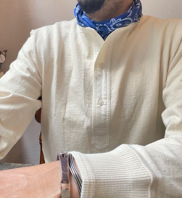 着用すると、このちょっと高めの”襟”が、少し外側に”開く、跳ねる”感じが、『HENLEY/NECK』には、欲しいんです!、そうじゃないと、単に『CREW/NECK』に、”BUTTON”着けただけ?、に、なってしまう感があるから、なんですよ。