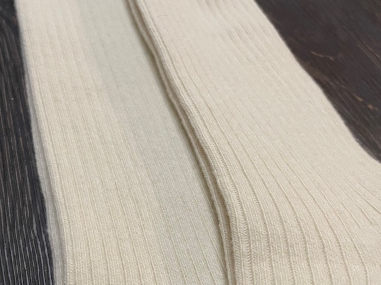 次に、『SOCKS』ですが、『SOCKS』は、”履き心地、フィット感”が、かなり重要となるので、どうしても、”完全別注”の、<強燃 CASHMERE YARN 100%>だけでは難しい為、<強燃 CASHMERE YARN 83%/NYLON 16%/POLYURETHANE 1%>の、混紡素材になります。
