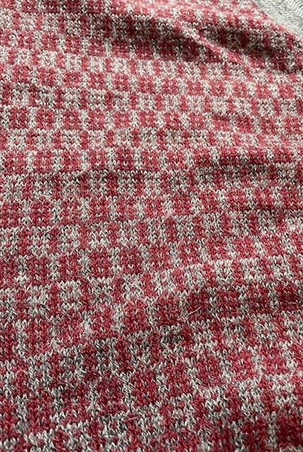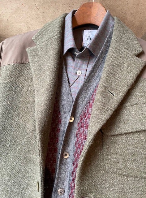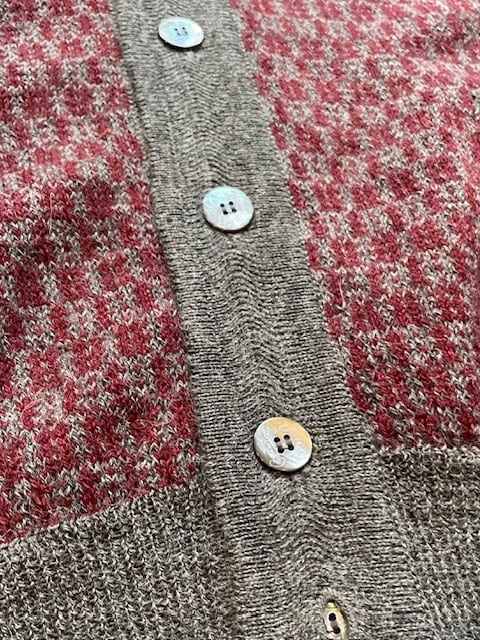 ”BODY”は、<col:BORDEAUX/GREY>の、<HOUND-TOOTH(千鳥格子)>の様な柄パターンで、”V/NECK〜前立て”・”アーム・ホール”、”裾”部分は、<col:GREY>の”RIB”なんですが、その”配色”が抜群だし、更に、”V/NECK〜前立て”のみ、”HERRINGBONE”的な”織”が入って、”BUTTONS”には、”ブランド名”入りの”SHELL-BUTTONS”を使用する等、”高級メゾン・ブランド”に匹敵する程の”拘り”と質の高さを、細部にまで感じる事が出来ます!!