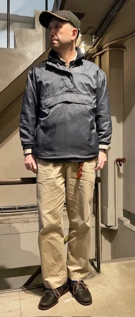 サイズ表記は、<size:S>、僕が着用した印象は、”袖丈”がちょっと”短め”の設定(僕は、この位の袖感が好きなんですけど)なんですけど、”肩幅&身幅”は、そこそこゆとりがある感じなので、<size:JPN S~M>位かなと思います。