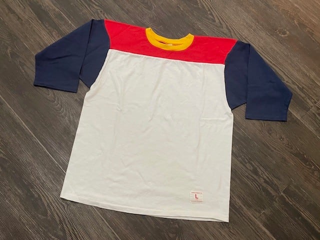 <60'S~70'S>頃の『CHAMPION 3/4 SLEEVE FOOT BALL TEE』がベースで、<col:WHITE(NAVY/RED/YELLOW)>の<MULTI(PANEL)-PATTERN>、僕の好きな”要素”だらけで、PICK UPしないという選択は、ありませんでした!!