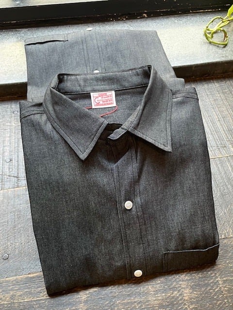 『CHEMISE COWBOY』と名付けられた、”AMERICAN TASTE”の『SHIRT』、その”特徴”は、何と言っても、<BLACK DENIM(先染め)>を使用した、『REG-COLLAR SHIRT』という点!、良く似た<素材=CHAMBRAY>と比べると、奥行きのある”色感”が、非常に良いです。