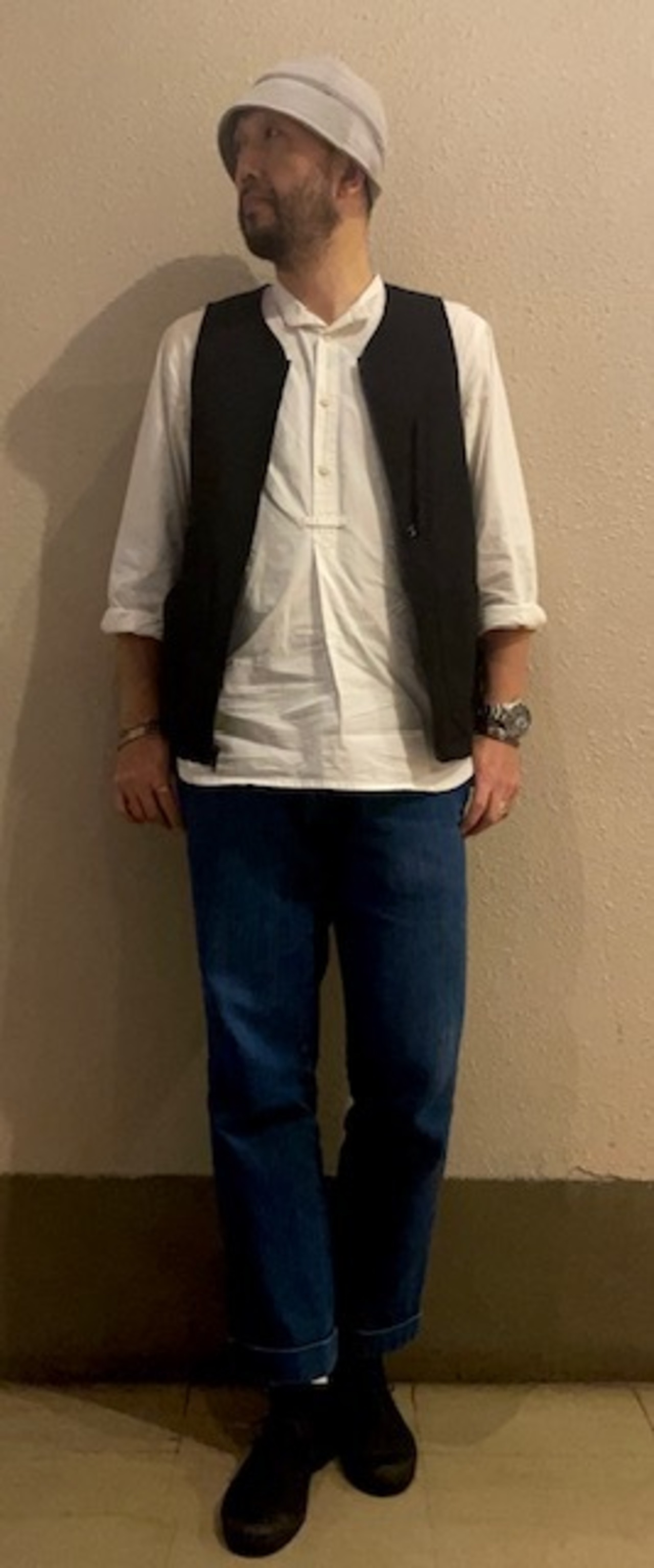 裾を出して(TUCK-OUT)、”ラフ”に羽織るイメージで着ても良いし、”TUCK-IN”して、同テイストの『WORK PANTS(&MILITARY PANTS)』を合わせるのも、ええな〜と思います。