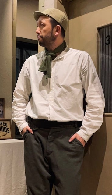 〔時は<1920’S〜30'S頃>。当時の『WORKERS&FARMERS』が着用していた、イギリスを代表する、伝統的な『SHIRT』から、インスピレーションを得て、作成しています。襟型が”BAND COLLAR”なのは、彼らが、この形を好んだ理由=各々で使用する『機械、工具』等に引っかかる事を恐れて、その当時は日常的だった『NECK TIE』を着用しなかったから〕という事柄を、ストーリーとしています。