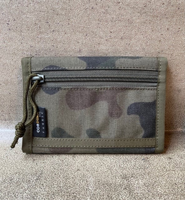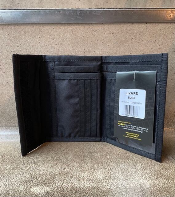 大きさは<縦×横=10×14(cm)>、『TRI-FOLD(三つ折り)』型なんで、広げると<25.5cm>の大きさです。外側に”小銭入れ”があって、内側にお札入れが<2つ>と、カード入れが<5つ>あります。その内1つは”クリア”仕様で、内容的には、結構入りますよ!。”ヴィジュアル”は、ベルクロの下に、小さく『WISPORT』の”タブ”、小銭入れ部分に『CORDURA』の”タブ”が付くだけなので、非常にシンプルです。