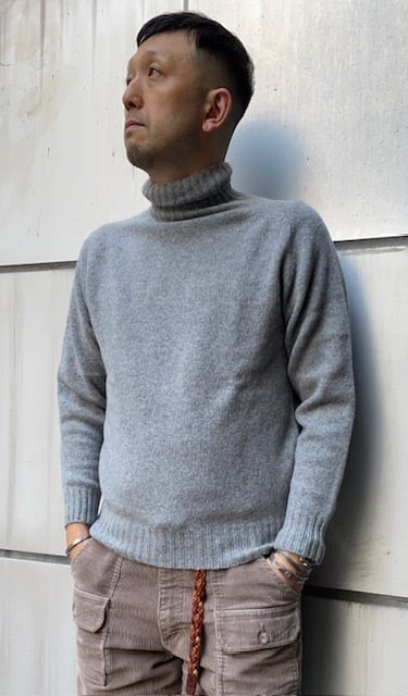 その理由は、僕の中での『SHETLAND SWEATER』って、いかにも、”タフ”で、暖かそうな雰囲気、”ゴワッ”とした、”硬さ”や”厚み”が、絶対的に欲しいから、なんですよね。しかしながら、『HARLEY OF SCOTLAND』では、どうしても『FULL-FASHIONED SWEATER』だからこそ、”硬さ&厚み”ある『モノ(SWEATER)』が、作れない、出来ないんです。